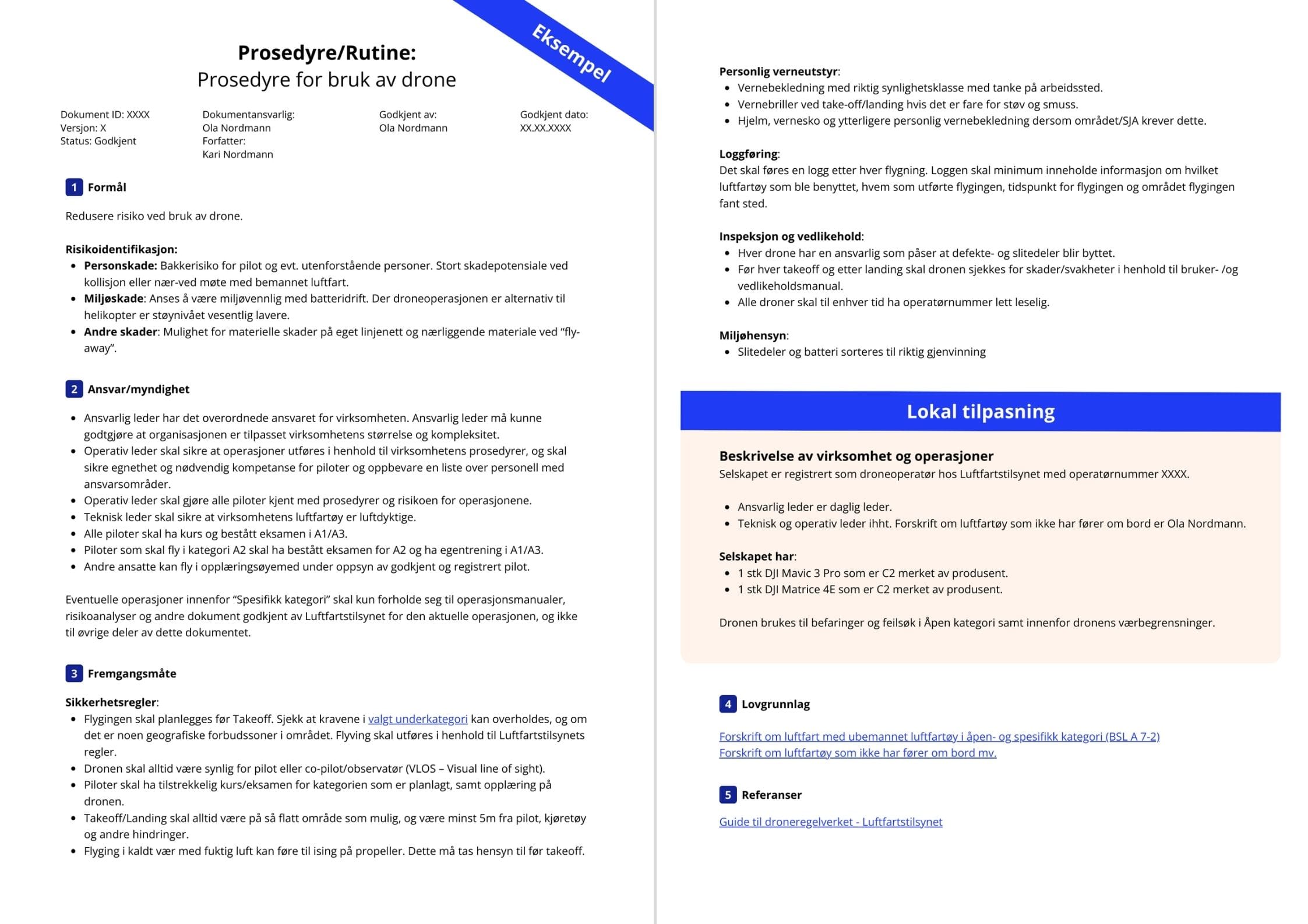 Eksempel på et styrende dokument der hovedinnholdet forvaltes sentralt, mens lokale presiseringer legges inn i eget felt som del av et utvidet dokument.